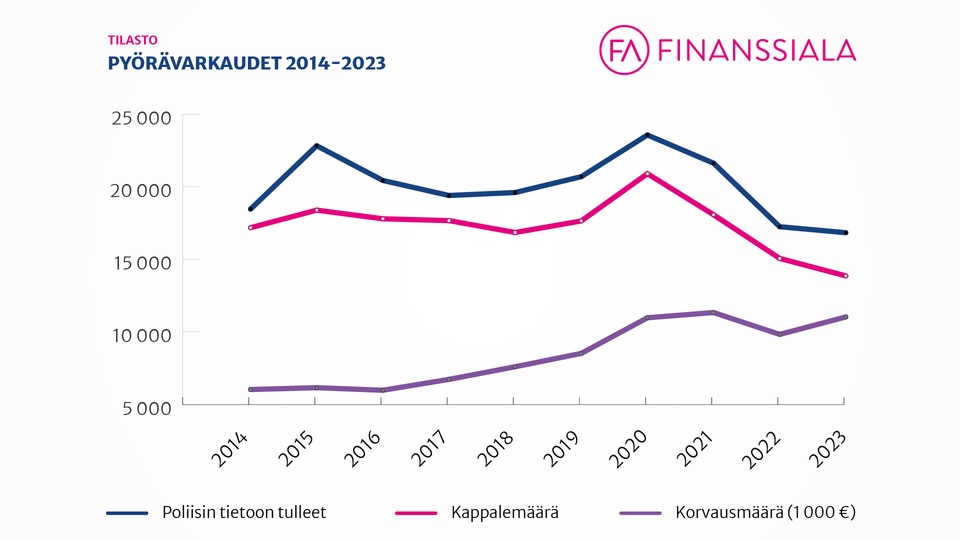 Vakuutusyhtiöt korvasivat 13 865 varastettua pyörää vuonna 2023. Edellisvuonna luku oli 15 068. Poliisille ilmoitettiin 16 840 varastettua pyörää, edellisvuonna luku oli 17 253. Varastettuja pyöriä korvattiin 11 miljoonan euron edestä, edellisvuonna summa oli 9,8 miljoonaa.