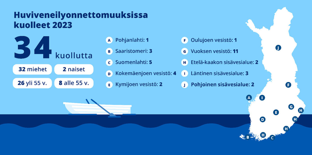 Huviveneilyonnettomuuksissa menehtyneistä 32 oli miehiä ja kaksi naisia. Vuosien 2014–23 aikana huviveneilyonnettomuuksissa Suomessa on menehtynyt 27–52 henkeä vuosittain. Viime vuonna eniten kuolemantapauksia oli Vuoksen vesistöjen alueella ja Suomenlahdella.