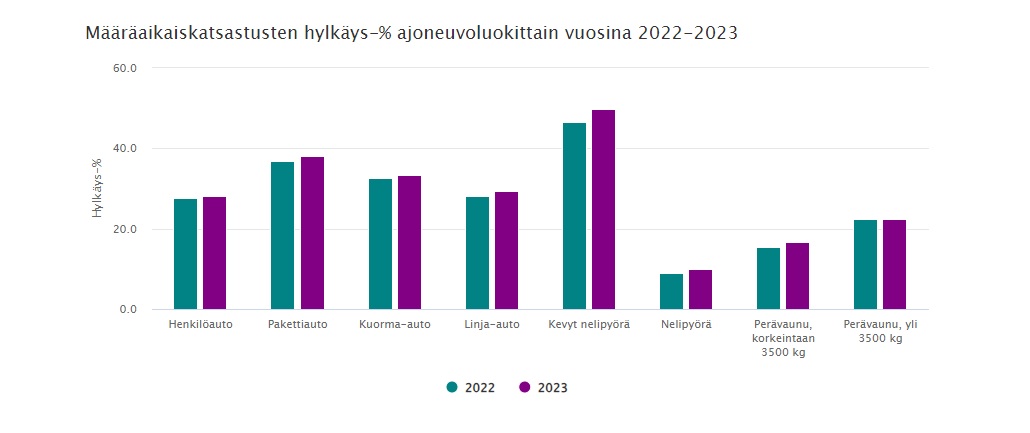 Suomessa tehtiin vuonna 2023 yli 2,1 miljoonaa henkilöauton määräaikaiskatsastusta, joista 28,2 prosenttia päättyi hylkäykseen. Hylkäysprosentti pysyi lähes muuttumattomana edellisvuoteen verrattuna. Samaan aikaan sähköautojen katsastuksissa todettiin merkittävää lisäystä niin katsastusten määrässä kuin hylkäysprosenteissakin. Vuodessa sähköautojen hylkäysprosentti on kasvanut lähes seitsemän prosenttiyksikköä, nousten 11,7 prosentista 18,4 prosenttiin.