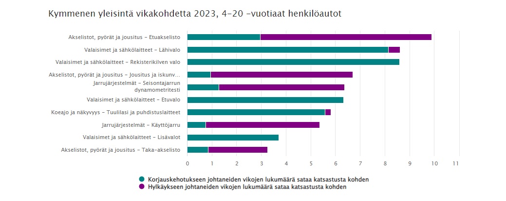 Lähes joka kymmenes katsastettu henkilöauto hylättiin tai se sai korjauskehotuksen etuakseliston vikojen takia. Rekisterinkiven valon sekä lähivalojen toimimattomuudesta puolestaan määrättiin korjauskehotuksia yli kahdeksassa katsastuksessa sadasta.