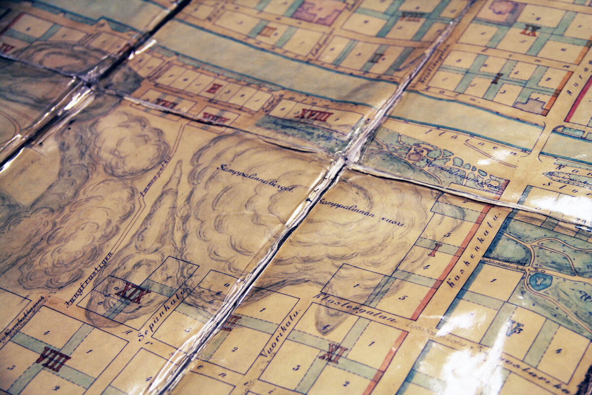 Nopeallakin vilkaisulla kartasta paikallistaa Aurajoen, mutta nyt ei olla minkä tahansa Turun kartan äärellä. Turun kaupunginarkiston pöydällä on Turun asemakaava vuodelta 1897.