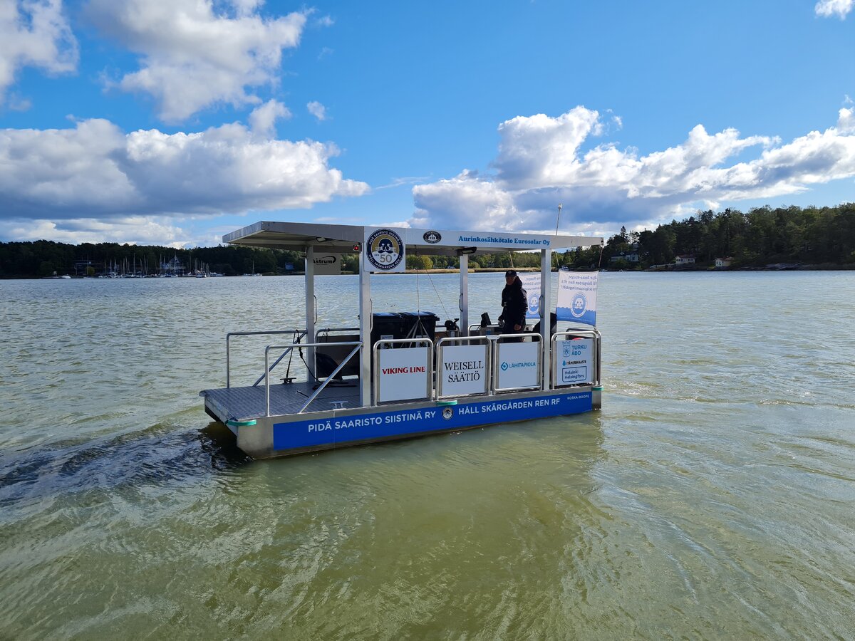 Pidä Saaristo Siistinä ry:n pienin työalus Roska-Roope työskentelee Tall Ships Races -tapahtuman ajan torstaista sunnuntaihin 18.–21. heinäkuuta Aurajoessa keräten pintaroskaa vedestä.