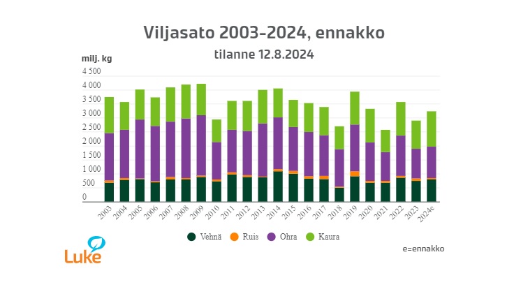 Luonnonvarakeskuksen (Luke) tämän vuoden ensimmäisen satoarvion mukaan viljasato on jäämässä keskimääräiseksi, noin 3,3 miljardiin kiloon. Kaurasato on neljänneksen keskimääräistä suurempi. Ruissato on jäämässä lähes puoleen ja ohrasato viidenneksen keskimääräisestä. Vehnästä odotetaan normisatoa.
