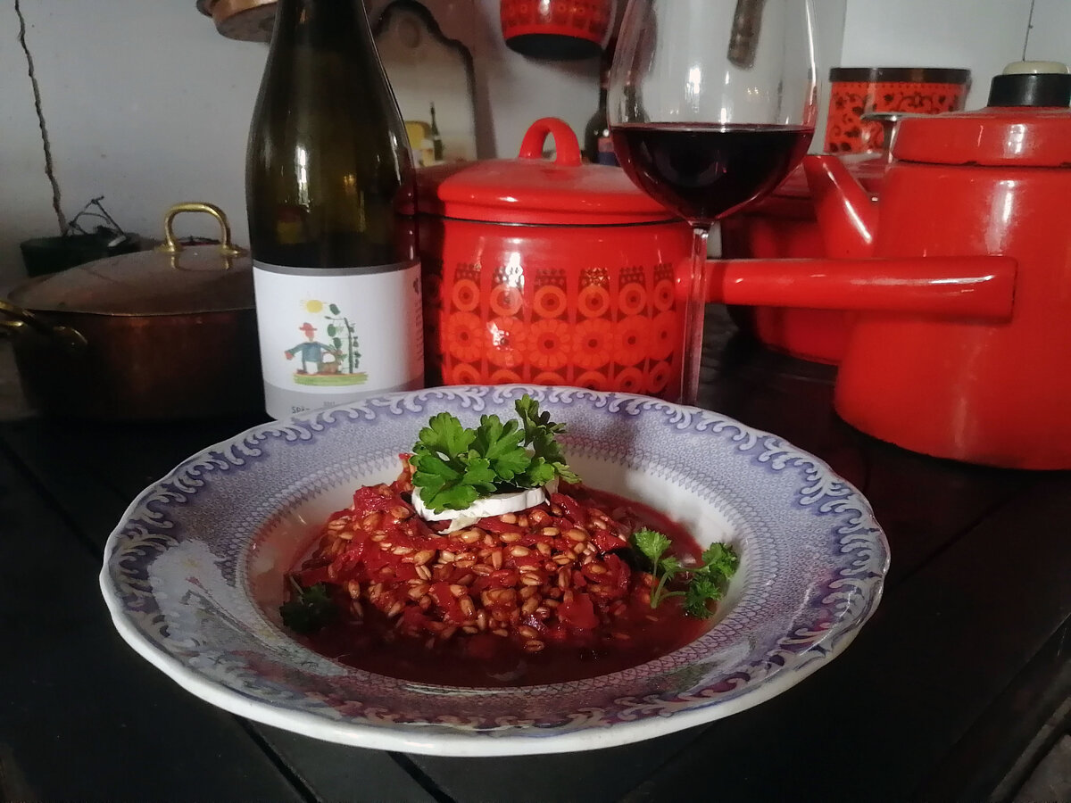 Viinistä puolet on jo hekumoiden juotu ennen pääruokaa, joka on punajuuri-vuohenjuustorisotto kotimaiseen spelttiin tehtynä. Se on ekologisempi ja maultaan ”lihaisampi” valinta kuin Arborio-riisi, mutta kypsyy hitaammin. Purutuntuma ei haittaa tämän spätburgunderin kanssa, josta liraus on päätynyt myös pannulle.