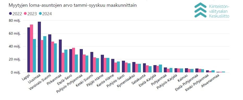 Kokonaisarvoltaan suurimmat mökkikaupat tehtiin touko–syyskuun aikana Uudellamaalla (43,1 miljoonaa, 32,2 % ed. vuoden arvoon verrattuna). Seuraavaksi arvoltaan kalleimpia kauppoja solmittiin Varsinais-Suomessa (36,2 miljoonaa euroa, 8,4 % ed. vuosi) sekä Lapissa (31,2 miljoonaa euroa, 26,1 % ed. vuosi).
