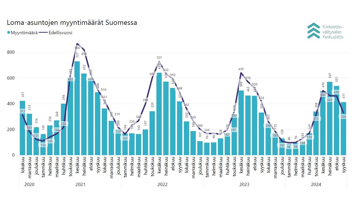 KVKL Hintaseurantapalveluun tallennetun datan perusteella touko–syyskuussa myytiin yhteensä 2 349 loma-asuntoa, joista käytettyjä oli 2 339 ja uusia kymmenen. Viime vuoden vastaavaan jaksoon verrattuna käytettyjen loma-asuntojen kokonaiskauppamäärä oli 13,8 prosenttia suurempi ja viiden vuoden keskiarvomääristä jäätiin 12,9 prosenttia. Uusien loma-asuntojen kohdalla ei tullut muutosta edellisvuoden kauppamääriin, viiden vuoden keskiarvosta jäätiin 45,7 prosenttia.