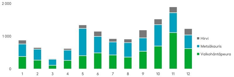 Suuri osa syksyn ja alkutalven riistaeläinonnettomuuksista sattuu valkohäntäpeurojen kanssa, mutta myös metsäkauriiden osuus onnettomuuksissa on kasvanut. Valkohäntäpeurat olivat viime vuoden marraskuussa osallisina yli puolessa onnettomuuksista, ja metsäkauriit lähes kolmasosassa.