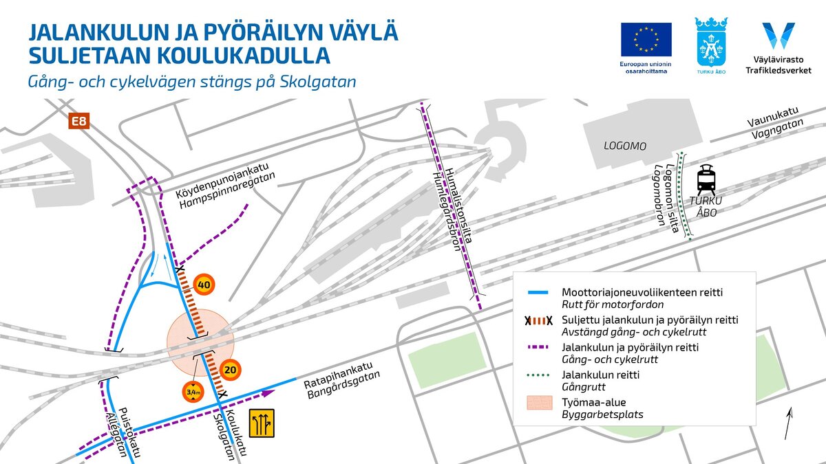 Töiden vuoksi jalankulku ja pyöräily on siirretty kiertoreitille ja yksi ajokaista suljettu moottoriajoneuvoliikenteeltä 28. lokakuuta alkaen. Töiden edetessä vaihtelee se, mikä kolmesta kaistasta on suljettuna.