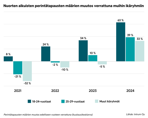 Nuorten aikuisten ja muiden ikäryhmien perintätapausten määrien muutos edelliseen vuoteen verrattuna.
