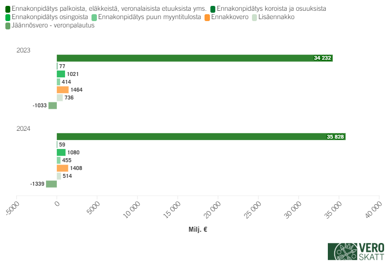 Palkkikaaviossa henkilöasiakkaiden tuloverokertymä vuosien 2023–24 aikana. Vuonna 2023 kertymä oli 36,9 miljardia euroa ja vuonna 2024 38,0 miljardia euroa. Kasvu johtuu pitkälti ennakonpidätysten määrän kasvamisesta.Arvonlisäveron kertymässä pieni piikki ennen yleisen alv-kannan nousua