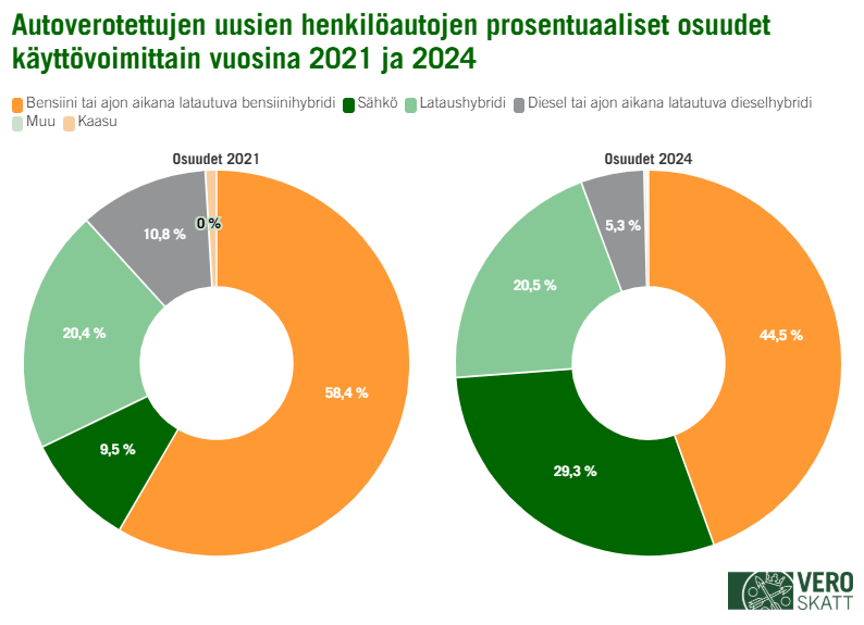 Uusista henkilöautoista toiseksi suurin osa (29,3 %) oli vuonna 2024 sähköautoja (vastaava osuus 33,2 % vuonna 2023). Uusien sähköautojen osuuden lasku johtui siitä, että vuonna 2023 sähköautoja rekisteröitiin poikkeuksellisen paljon, kun autotehtaiden toimituksia viivästyttänyt komponenttipula helpotti.