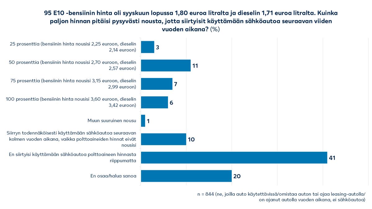 Kymmenen prosenttia kertoo siirtyvänsä todennäköisesti käyttämään sähköautoa seuraavan kolmen vuoden aikana, vaikka polttoaineiden hinnat eivät nousisi. Sen sijaan 41 prosenttia ei siirtyisi käyttämään sähköautoa polttoaineen hinnasta riippumatta. 20 prosenttia ei osaa tai halua sanoa.