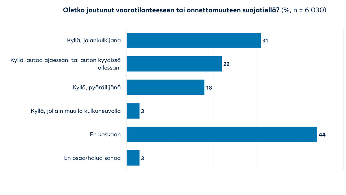 Useampi kuin joka toinen suomalainen (53 prosenttia) on joutunut vaaratilanteeseen tai onnettomuuteen suojatiellä, selviää LähiTapiolan teettämästä Arjen katsaus -kyselystä. Lähes kolmannes (31 prosenttia) kertoo näin tapahtuneen jalankulkijana. 22 prosenttia on joutunut vaaratilanteeseen tai onnettomuuteen suojatiellä autoa ajaessaan tai auton kyydissä ollessaan, 18 prosenttia pyöräilijänä. Kyselyn toteutti tutkimusyhtiö Verian*.