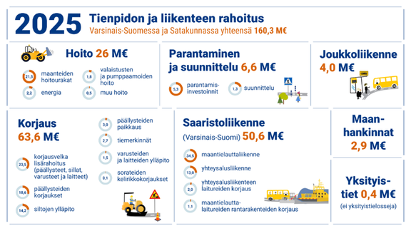 Varsinais-Suomen ELY-keskuksen alueen tienpidon rahoitus on tänä vuonna noin 160 miljoonaa euroa. Alueen perusväylänpidon rahoitus on noin 132 miljoonaa euroa sisältäen 23,5 miljoonaa euroa korjausvelan lisärahoitusta.
