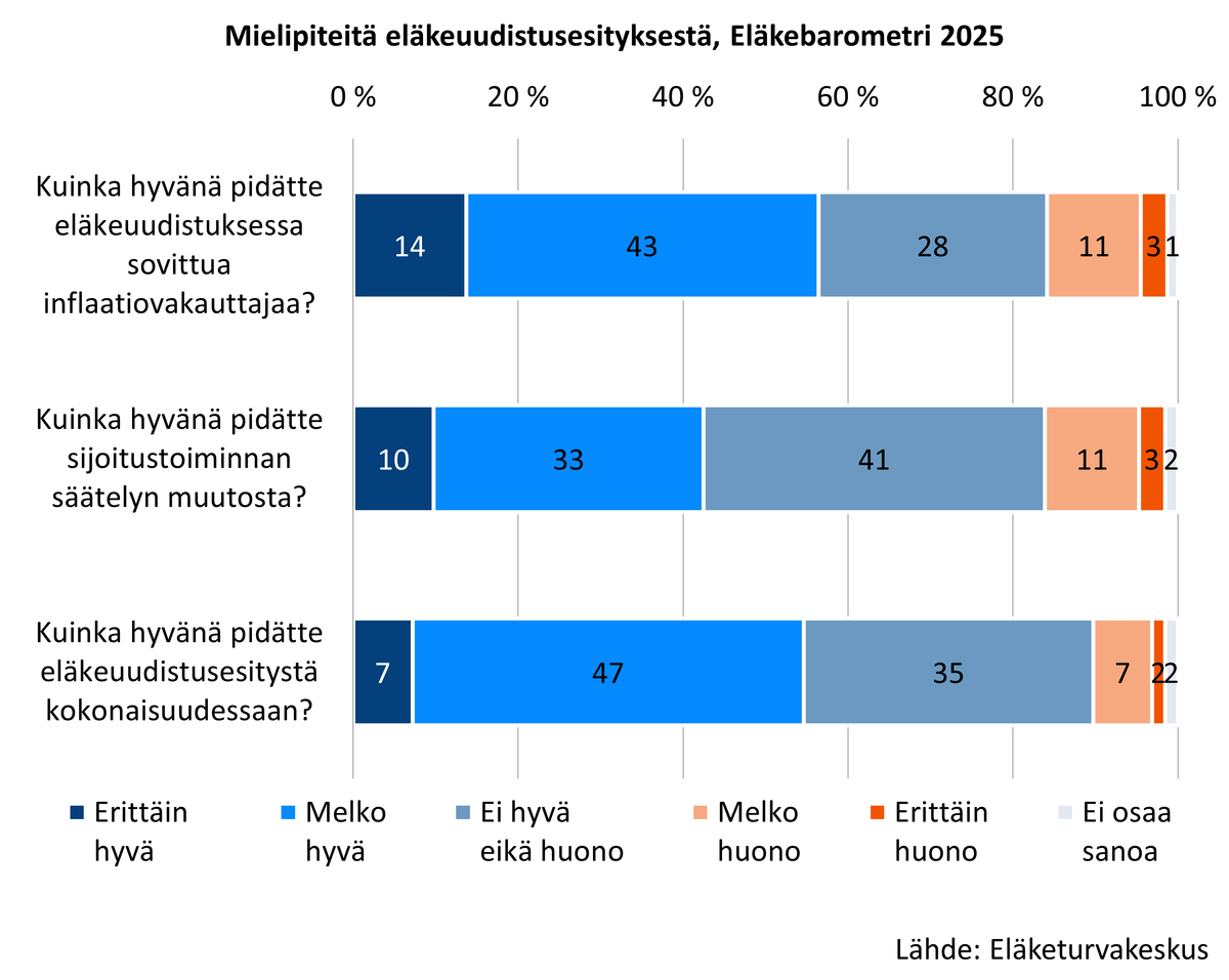 Eläkebarometrissa kysyttiin yli 18-vuotiailta suomalaisilta, miten hyvinä he pitävät tammikuussa neuvotellun eläkeuudistusesityksen keskeisiä toimia. Vastaajista lähes 60 prosenttia piti neuvoteltua inflaatiovakauttajaa vähintään melko hyvänä.