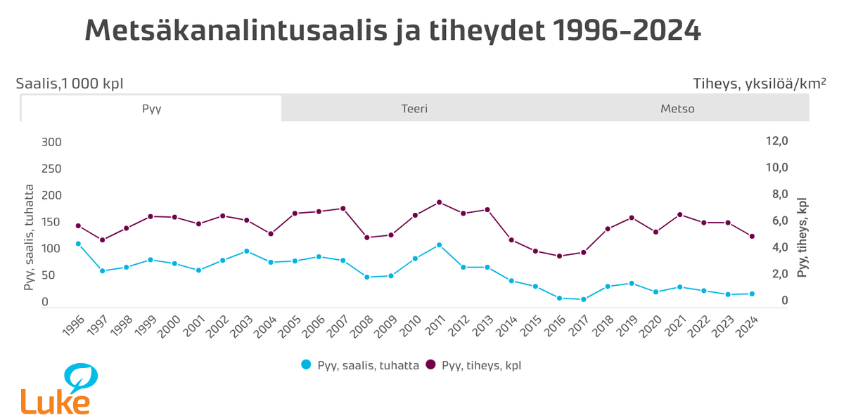 Sepelkyyhky on saalismäärältään runsain riistalajimme, ja vuoden 2024 saalis oli noin 264 000 yksilöä. Keskimääräinen sepelkyyhkysaalis saalista saanutta metsästäjää kohden oli 10 sepelkyyhkyä. Pyydetyimmän vesilintumme sinisorsan saalismäärä oli noin 123 000 yksilöä, ja tavisaalis 42 000 yksilöä.