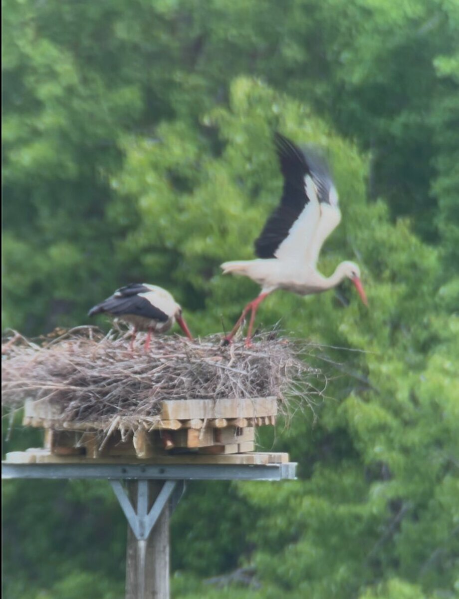 Valtakunnan silmäteräksi sittemmin noussut haikarapariskunta otti korkeaan tolpannokkaan rakennetun keinopesän nopeasti omakseen. Pari yllätettiin rakkauspuuhista pesällään huhtikuun loppupuolella, ja emo muni toukokuussa arvoitukseksi jääneen määrän munia, joista on nyt todistettavasti kuoriutunut kesäkuun alkupuolella yksi pienokainen.