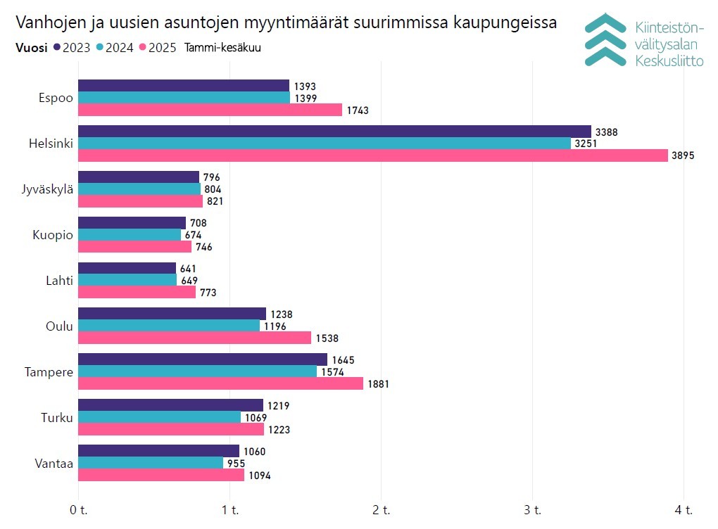Kiinteistönvälitysalan Keskusliiton ylläpitämään KVKL Hintaseurantapalveluun raportoitiin tammi–kesäkuussa yhteensä 27 198 vanhojen asuntojen kauppaa (18,8 % ed. vuoden vastaava jakso, -6,7 % 5 vuoden keskiarvo) ja 892 uudisasunnon myyntiä (-8,1 %, -72,6 % 5 v. ka), eli yhteensä 28 090 asuntokauppaa (17,7 %, -13,3 % 5 v. ka).