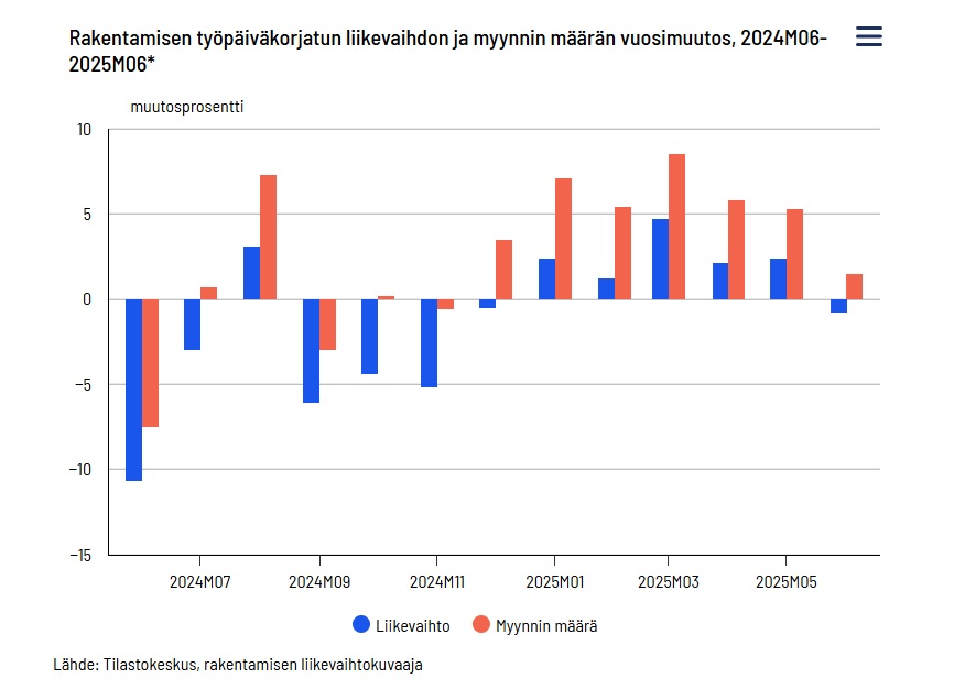 Tilastokeskuksen mukaan rakennusyritysten työpäiväkorjattu liikevaihto laski kesäkuussa 0,8 prosenttia vuodentakaiseen verrattuna. Myynnin määrä, josta hintojen muutosten vaikutus on poistettu, kasvoi 1,5 prosenttia.