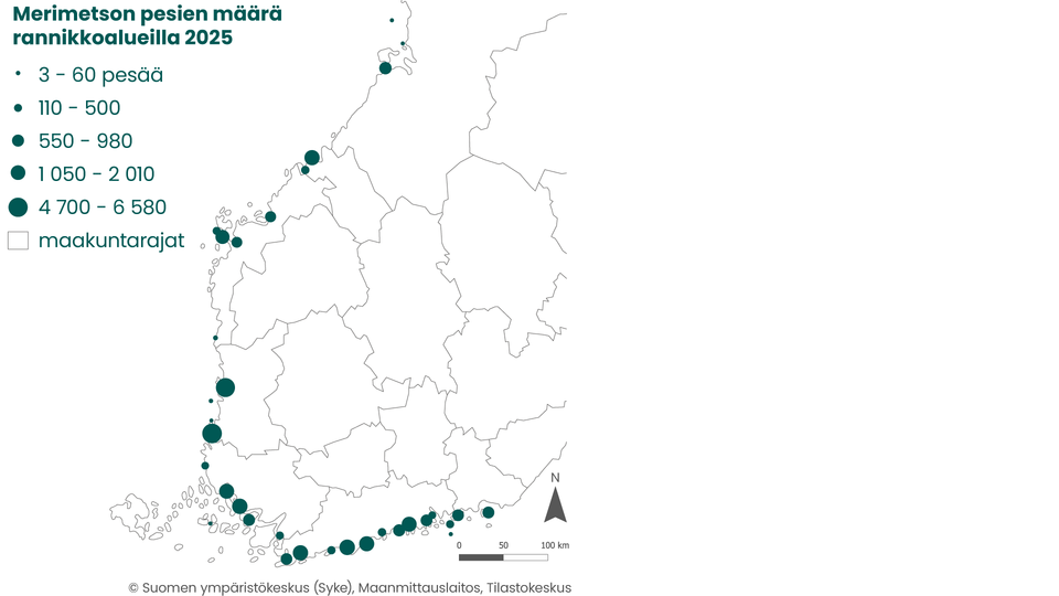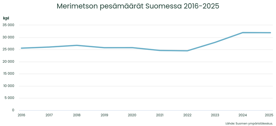 Merimetson pesiä laskettiin kesällä Suomessa noin 31 910. Pesimäkanta pieneni edelliskesästä yhdellä prosentilla, noin 280 pesän verran. Muutos viime vuoteen on merkittävä, sillä vielä viime vuoden kesällä kannan kasvu oli 15 prosenttia pesien määrän ollessa 32 190.