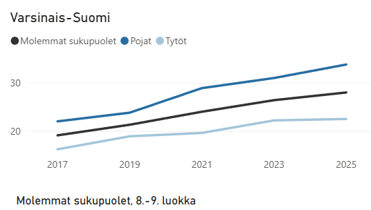 Kevään kyselyn mukaan 8.–9.-luokkalaisista hieman yli neljännes ilmoitti liikkuvansa noin tunnin päivässä. Vaikka kehitys on sekä koko maan, Satakunnan että Varsinais-Suomen osalta positiivisesti loivassa kasvussa, niin edelleen lähes 70 prosenttia ikäryhmästä ei täytä tätä terveyden kannalta suositeltua liikunnan määrää. Huomattava osa nuorista liikkuu terveytensä ja hyvinvointinsa kannalta liian vähän.