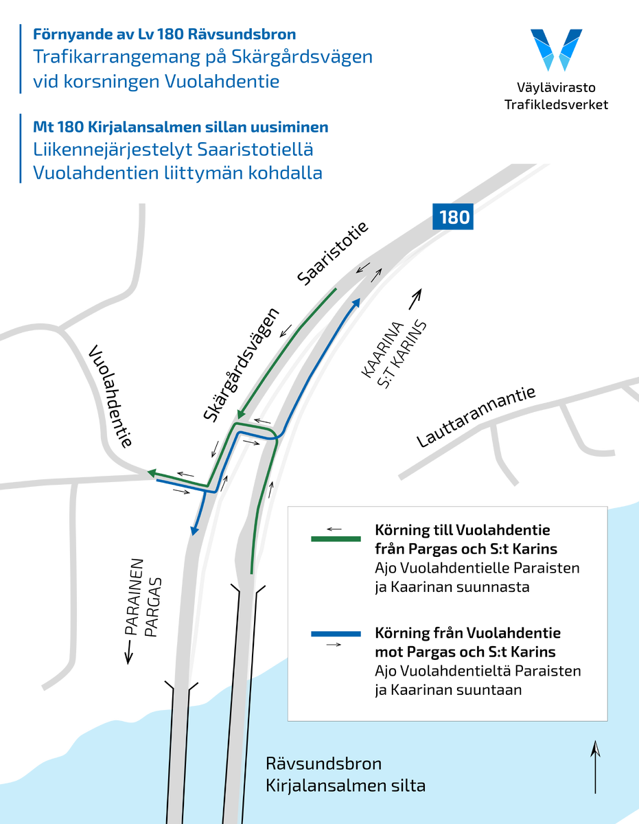 Liikennejärjestelyt muuttuvat hetkellisesti lokakuussa myös Vuolahdentieltä Saaristotielle ajettaessa. Liikennejärjestelyt on opastettu tiedotteen liitteenä olevassa kartassa.