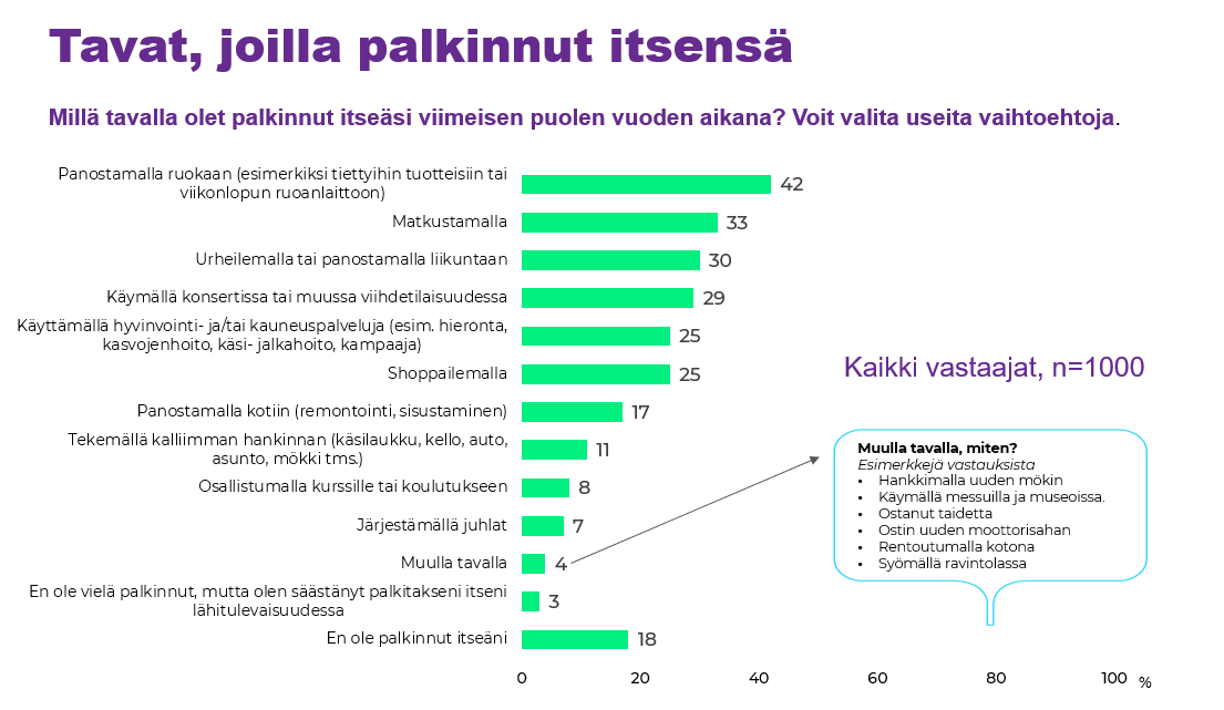 POP Pankin teettämän selvityksen mukaan suomalaiset ovat palkinneet itseään viimeisen puolen vuoden aikana panostamalla ruokaan (42 %), matkustamalla (33 %) tai liikkumalla (30 %). Shoppailemalla itseään on palkinnut noin 25 prosenttia vastaajista. Miehistä ja 45–54-vuotiaista noin joka neljäs ei ole palkinnut itseään. Aktiivisemmin itseään hemmottelevat naiset sekä 18–34-vuotiaat (ei ole palkinnut itseään 13 %, 10 %). Pääkaupunkiseudulla itsensä palkitseminen on pienempiä kuntia yleisempää (ei ole palkinnut itseään 18 % vs. 25 %).