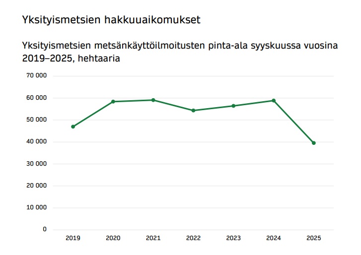 Yksityismetsien hakkuuaikomuksia ilmoitettiin tämän vuoden syyskuussa noin 39 500 hehtaarille koko maassa. Se on noin kolmannes vähemmän kuin vastaavaan aikaan viime vuosina keskimäärin.