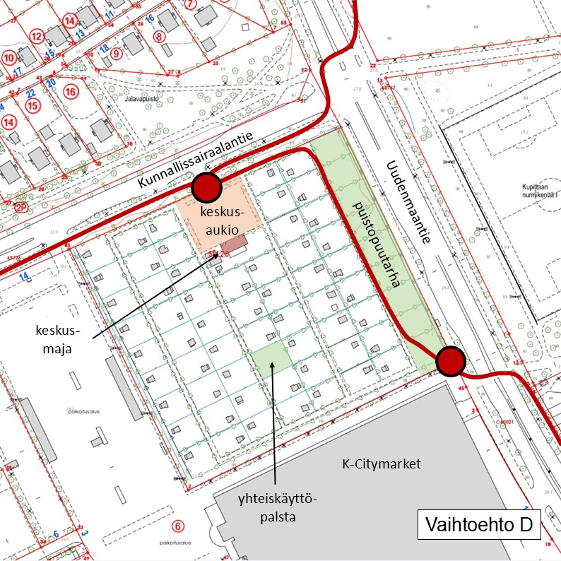 Keskusaukio sisällytetään vuokra-alueeseen. Yhdistys sitoutuu edistämään keskusaukion joustavaa käyttöä erilaisiin tapahtumiin, kuten ruokapäiviin, puutarhamarkkinoihin tai kirpputoreihin, sekä tarjoamaan keskusaukiolta kausimyyntipaikkoja esimerkiksi marjojen, vihannesten tai jäätelön myyntiä varten.
