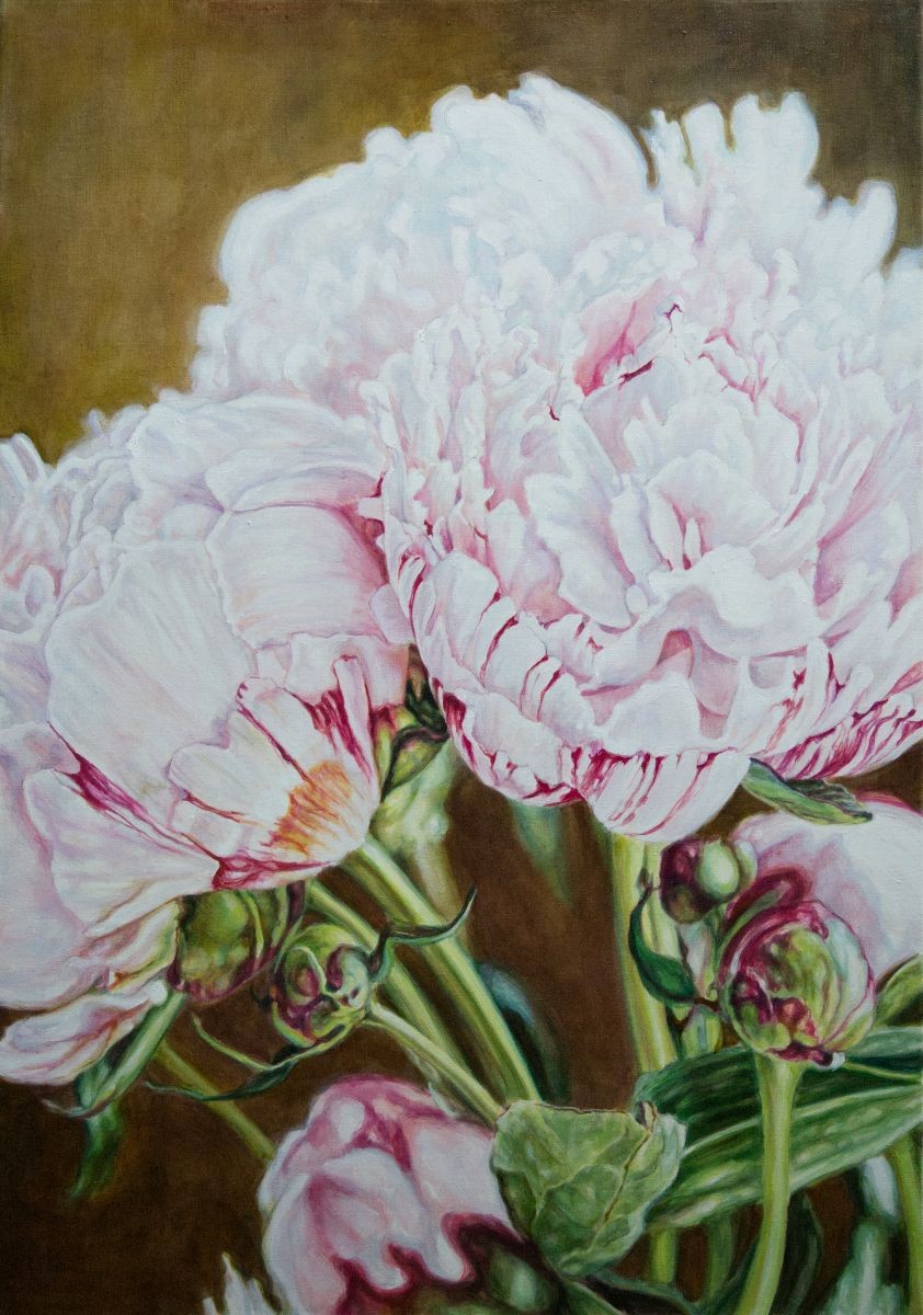 – Kukka-aiheisissa maalauksissani kohteet ylittävät arkipäiväisen kokonsa ja elinkaarensa muuttuen hetkessä uusiksi itsenäisiksi ja odottamattomiksi muodoiksi. Kukkien ajallinen rajallisuus on maalaustaiteessa klassinen aihe, ja sinänsä kiinnostava kontrasti hallittavien asetelmallisten ja sisätilamaalausten tutkimuksen kumppanina. Kasvien herkkyys, sitkeys, abstrakti eleganssi ja jopa joltisenkin röyhkeä yltäkylläisyys johdattavat mielenkiintoani edelleen uusille tutkimusretkille.