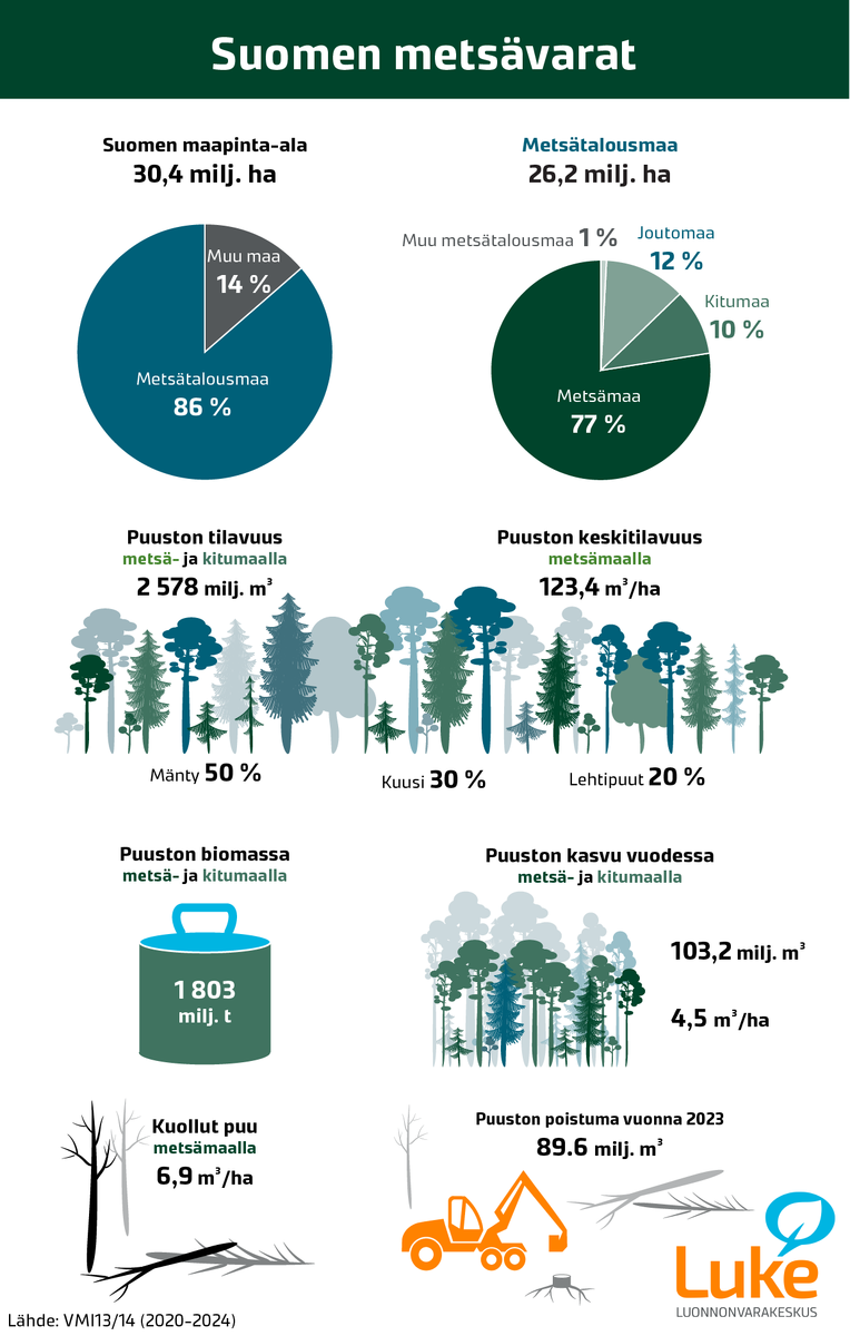 Tuoreimman mittaustiedon mukaan puuston vuotuinen kasvu on 103,2 miljoonaa kuutiometriä. Edellisvuonna arvio kasvusta oli 103,0 miljoonaa kuutiometriä, suurimmillaan kasvu on ollut 107,8 miljoonaa kuutiometriä. Luonnonvarakeskuksen (Luke) julkaisema uusin metsävaratieto perustuu valtakunnan metsien inventoinnissa (VMI) vuosina 2020–24 mitattuihin koealoihin.