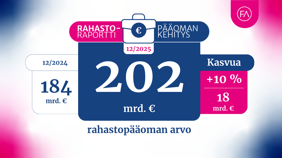Suomeen rekisteröityihin sijoitusrahastoihin sijoitettiin viime vuoden aikana yhteensä 5,6 miljardia euroa uusia pääomia. Samaan aikaan rahastopääomaa kasvatti myös myönteinen markkinakehitys. Yhteenlaskettu rahastopääoman arvo nousi vuoden lopussa kaikkien aikojen ennätykseen, lähes 202 miljardiin euroon, kun se vuotta aiemmin oli 184 miljardia.