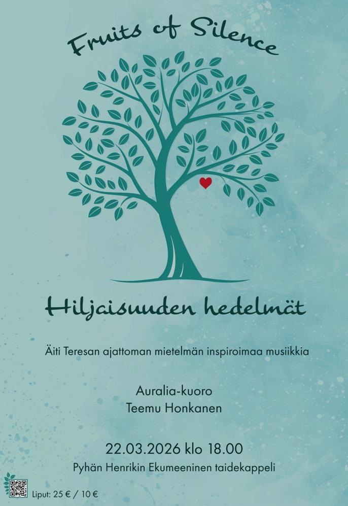Auralia-kuoro konsertoi marianpäivänä sunnuntaina 22. maaliskuuta kello 18 Pyhän Henrikin ekumeenisessa taidekappelissa. Hiljaisuuden hedelmät –konserttiohjelma rakentuu äiti Teresan tunnetun aforistisen runon ympärille ja kuljettaa kuulijaa hiljaisuuden, rukouksen ja rauhan teemoissa.