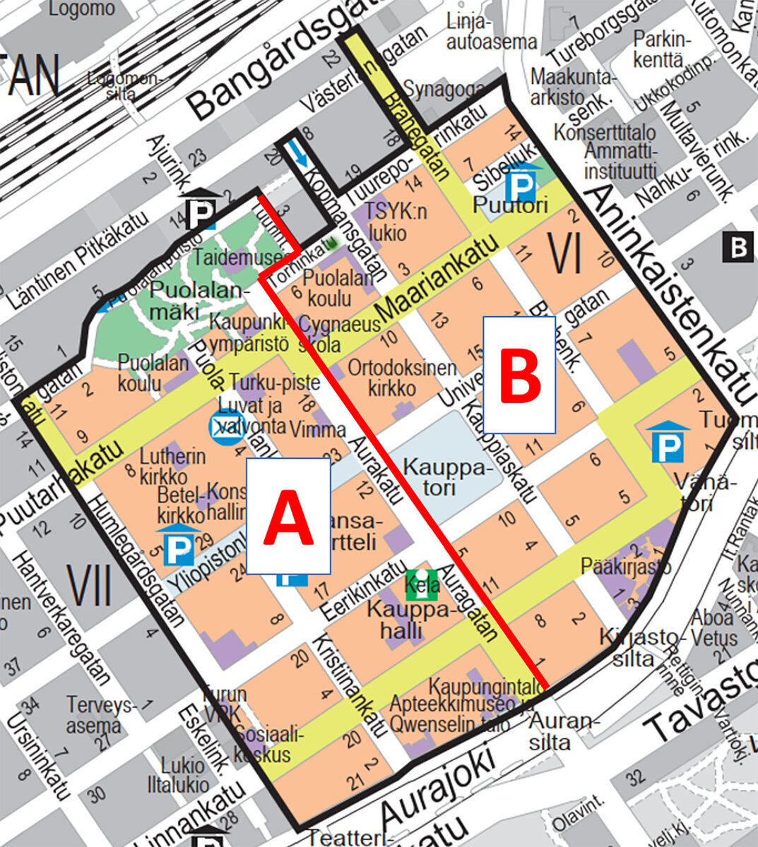 B-alue on Aninkaistenkadun ja Aurakadun välinen alue Aurajoelta Tornikadulle ja Tuureporinkadulle. Kauppiaskatu ja Brahenkatu tulevat mukaan kokonaan.