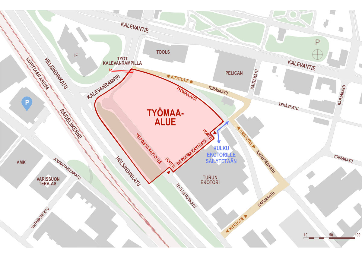 Turun Tiedepuistoa kehittävä Kupittaan kärjen kumppanuushanke käynnistää infran esirakentamisen sekä maanalaiset johtosiirrot työmaa-alueella ja Kalevanrampilla maanantaina 23. maanantaina. Samalla karsitaan alueen puustoa rakentamisen tieltä. Töiden arvioidaan kestävän kesäkuuhun saakka. Työmaan toiminnalla on vaikutuksia Kalevanrampin liikennejärjestelyihin 23. maaliskuuta lähtien. Osa Teollisuuskadusta ja Rautakadusta on jo tammikuusta lähtien ollut suljettuna liikenteeltä.