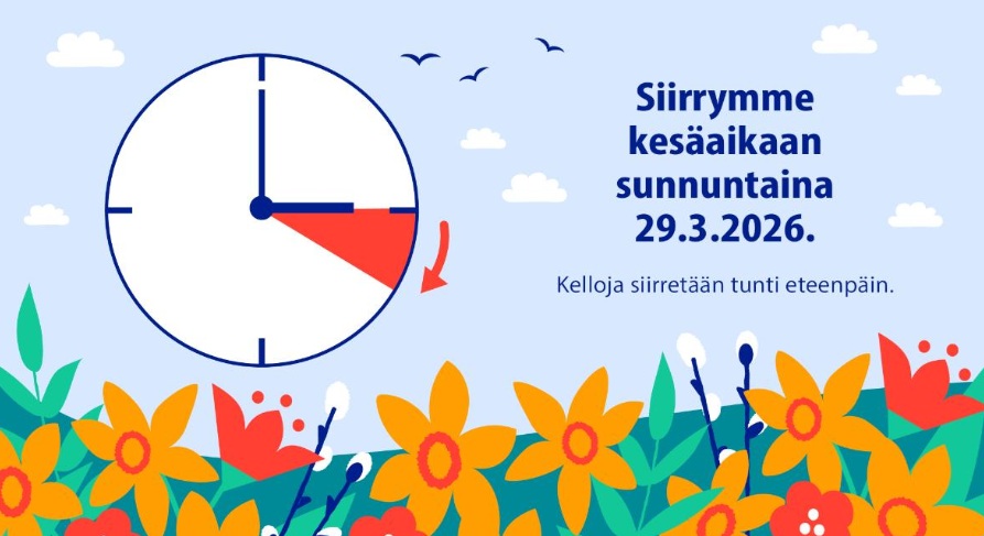 Talvi- eli normaaliaika päättyy ja kesäaikaan siirrytään lauantain ja sunnuntain välisenä yönä. Kellojen viisareita siirretään tunti eteenpäin ensi sunnuntaina 29. maaliskuuta aamuyöllä kello 3.