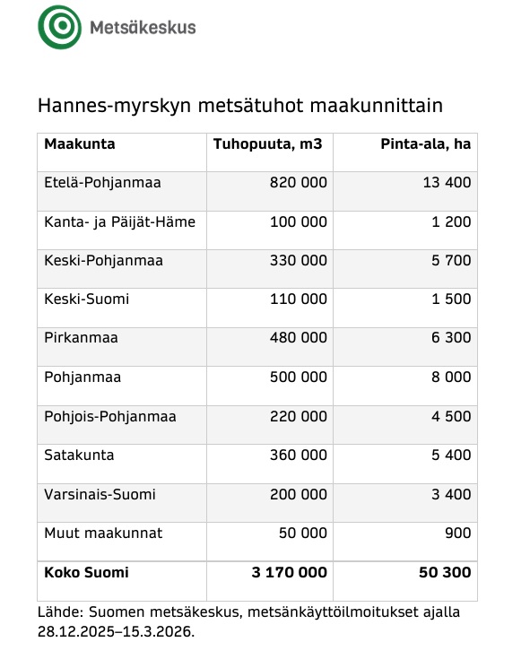 Hannes-myrskyn aiheuttamien metsätuhojen määrä on varmentunut viime kuukausina. Myrskytuhojen pinta-ala on kasvanut jo noin 50 000 hehtaariin. Myrskyssä kaatui puuta vähintään noin 3,2 miljoonaa kuutiometriä.