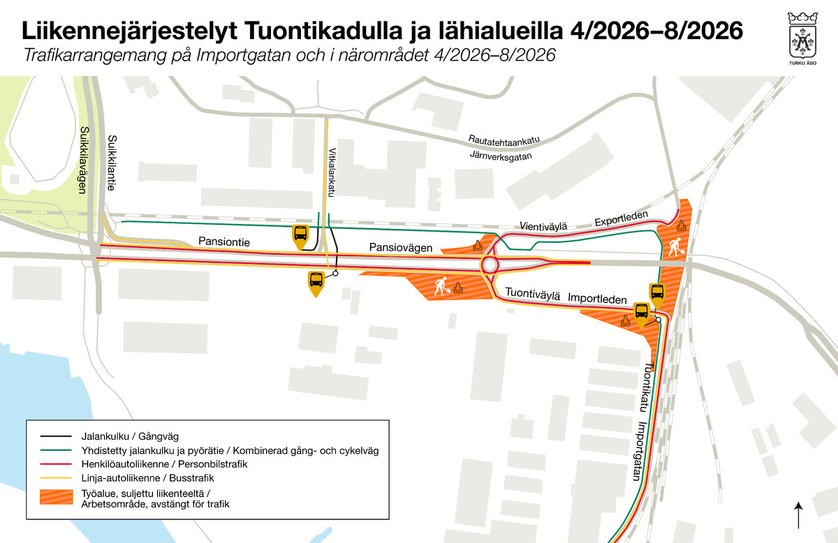 Turun sataman katujen uudistustyöt laajenevat urakka-alueen pohjoisosaan, jossa rakennetaan vaiheittain uusia kulkuyhteyksiä sataman kenttäalueelle. Tuontikatu suljetaan väliaikaisesti ajoneuvoliikenteeltä Pahaniemensillan alta välillä Vientiväylä–Tuontiväylä. Sulku on voimassa 28.4.–23.8.