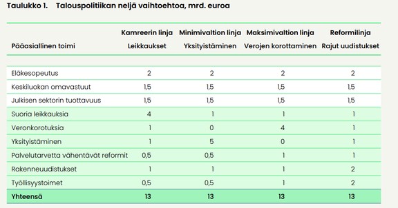 Analyysissä esitetään neljä vaihtoehtoista talouspoliittista linjaa, joiden kautta 13 miljardin euron sopeutustavoite voidaan saavuttaa. Sopeutuksessa voivat painottua leikkaukset, yksityistämiset, veronkorotukset tai rajut rakenteelliset uudistukset. Ideologisista eroista huolimatta jokaisessa vaihtoehdossa yhteisiä keinoja ovat kahden miljardin euron eläkesopeutus, 1,5 miljardin euron lisäys keskiluokan omavastuisiin sekä 1,5 miljardin euron parannus julkisen sektorin tuottavuuteen.